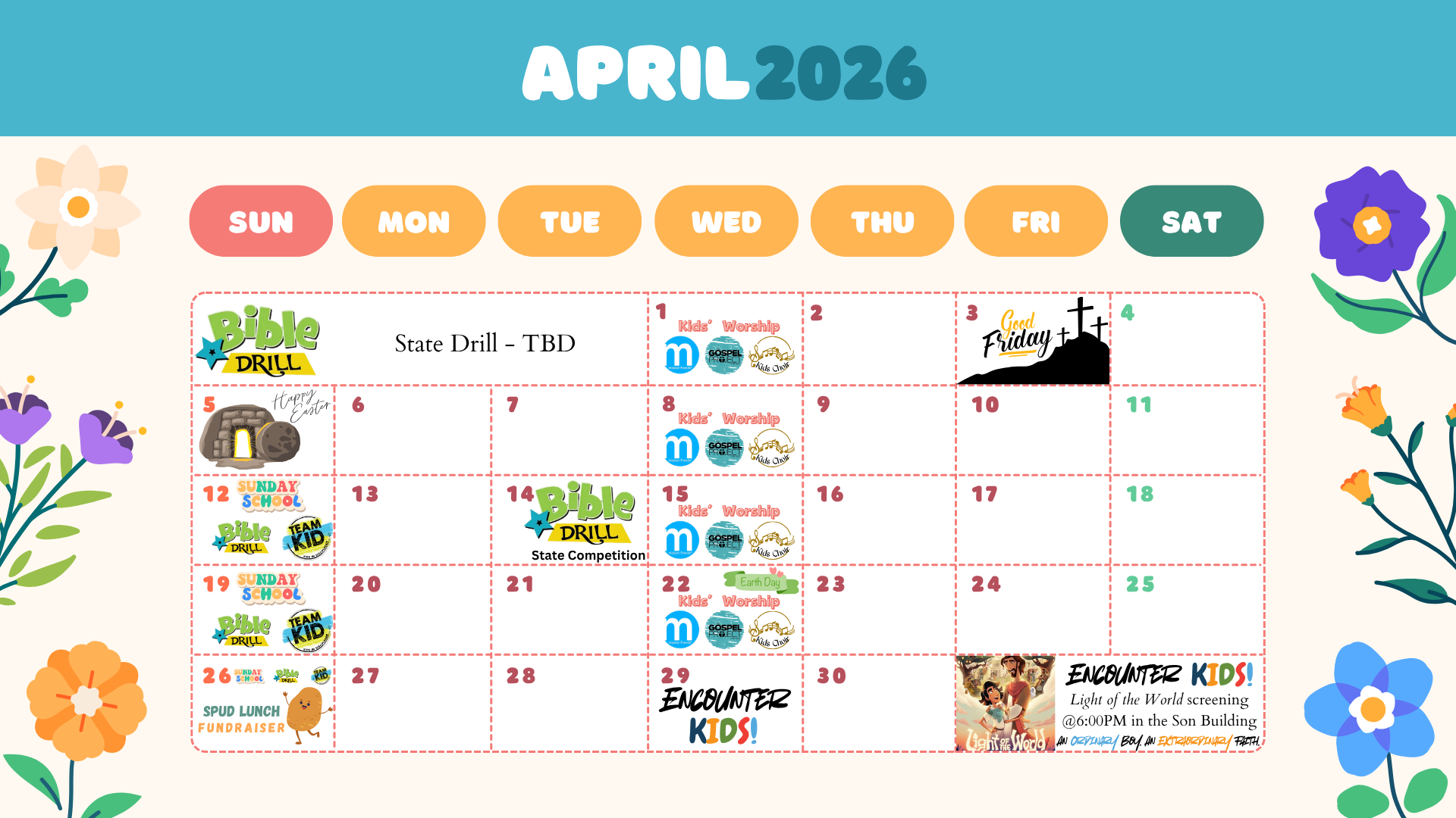 Sunday Evenings - 5:00 p.m. | Bible Drill and Team Kid in the Kid's Area Rally Room.